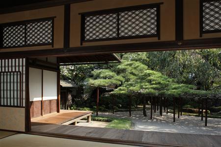現在の料亭に当たる「角屋(すみや)」の台所の造りは、意匠を凝らした座敷と違っていたって素朴だ。神棚や帳場…市中の商家と何ら変わりはない。しかし、決定的に違う点が一つある。それは大きさ。広さが50畳もあるのだ。文人の句会や新撰組など一度に多くの客が宴を催した。それを支えた台所は、役目は終えたいまも昔のまま保存されている。 ■角屋「松の間」 二世が伝える往時の姿 角屋は1641(寛永18)年、幕府命により六条三筋町(下京区)から島原に移転した。「当時はあたり一面が田んぼ。その中に1本の松があり、神木として近隣の信仰を集めていました。だから、松は残して移築したんです」と、財団法人「角屋保存会」理事長の中川清生(きよお)さん(61)は話す。 地域の祈りの対象だった松は、根本に白砂を敷き詰めて庭に取り込まれた。「臥龍松(がりょうのまつ)」だ。安藤広重は浮世絵のモチーフにし、京名所として江戸で紹介した。1本で臥龍を形作るほどの見事な松。広重に限らず、訪れる文人、墨客、画人らの格好の題材になった。立派な松に正座し、対峙(たいじ)していると-。 「残念ながら、大正時代末期に枯れてしまい…」と、中川さんは声を落とし、庭を眺めて続けた。「現在のものは二世です。1本で復元するのは無理だったようで、3本で当時の枝ぶりを再現しています」。臥龍松が最も姿美しく見えるところが「松の間」だ。広さ43畳。角屋一の大座敷である。